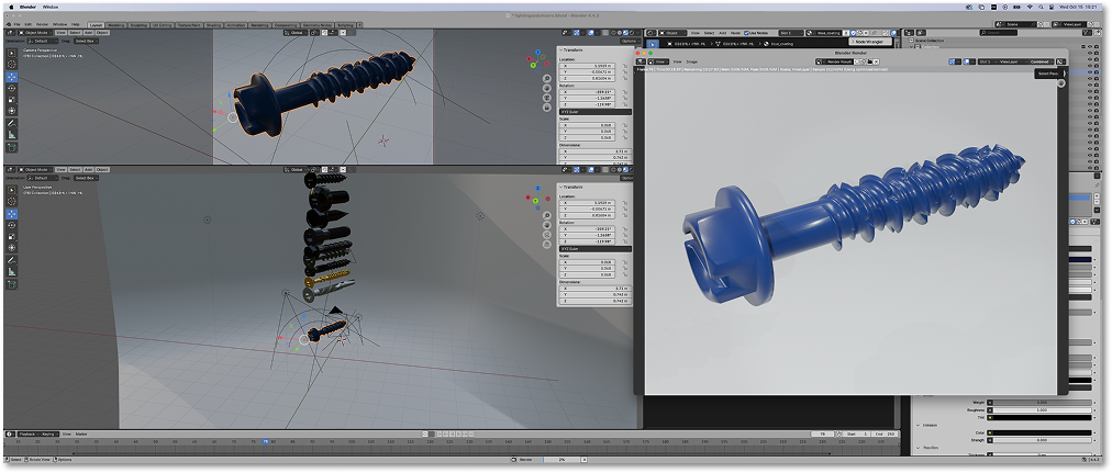 A look into my Blender workflow for product visualization. Each fastener render was created with studio lighting, an L-shaped plane for consistent shadows, and a fixed camera setup to maintain uniform angles across all assets. Materials were applied and refined to achieve technical accuracy and clean, marketing-ready visuals.