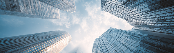 Wide angle upward shot of skyscrapers with glass windows. Reflecting sunlight with a clear blue sky, professional. --ar 7:3