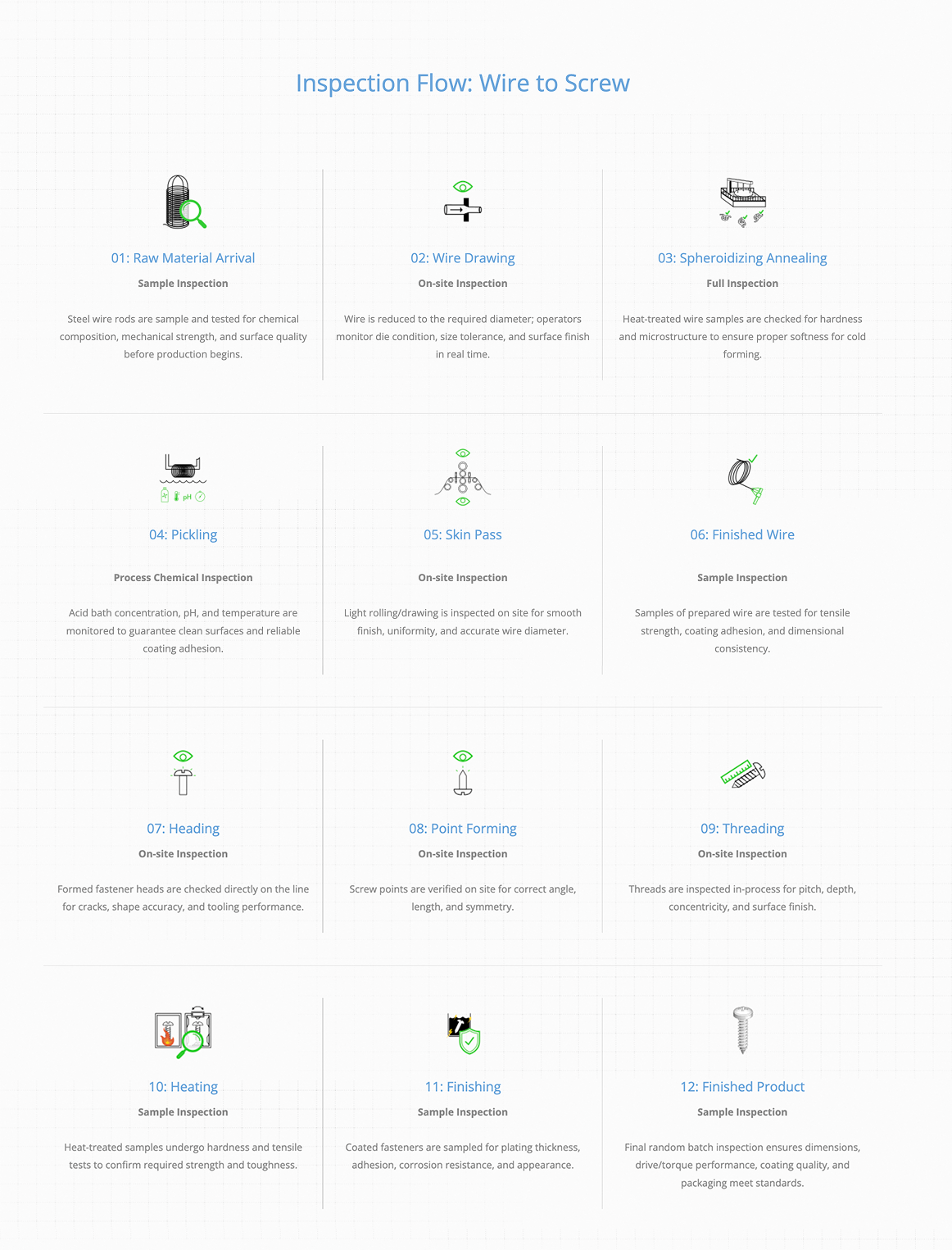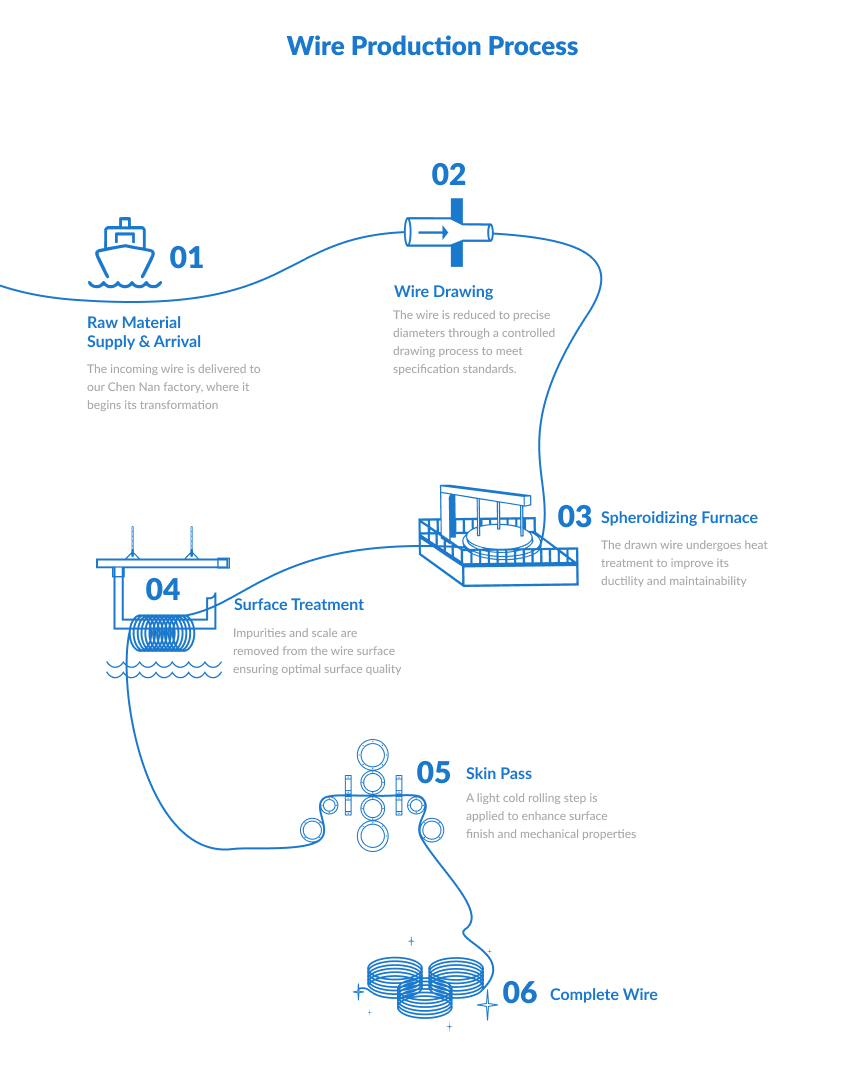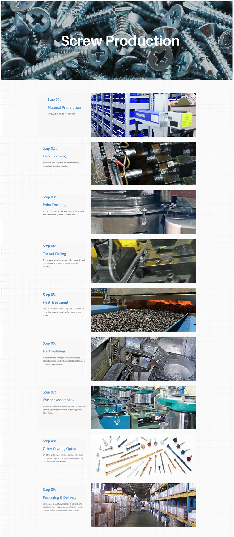 Custom-designed icons and flowcharts visualizing the complete fastener manufacturing journey — from wire production to screw forming, quality control, and OEM/ODM services. Each icon was crafted to accurately depict the machinery, tools, and steps used in RayFu’s processes, then simplified into clear, cohesive diagrams for easy understanding.