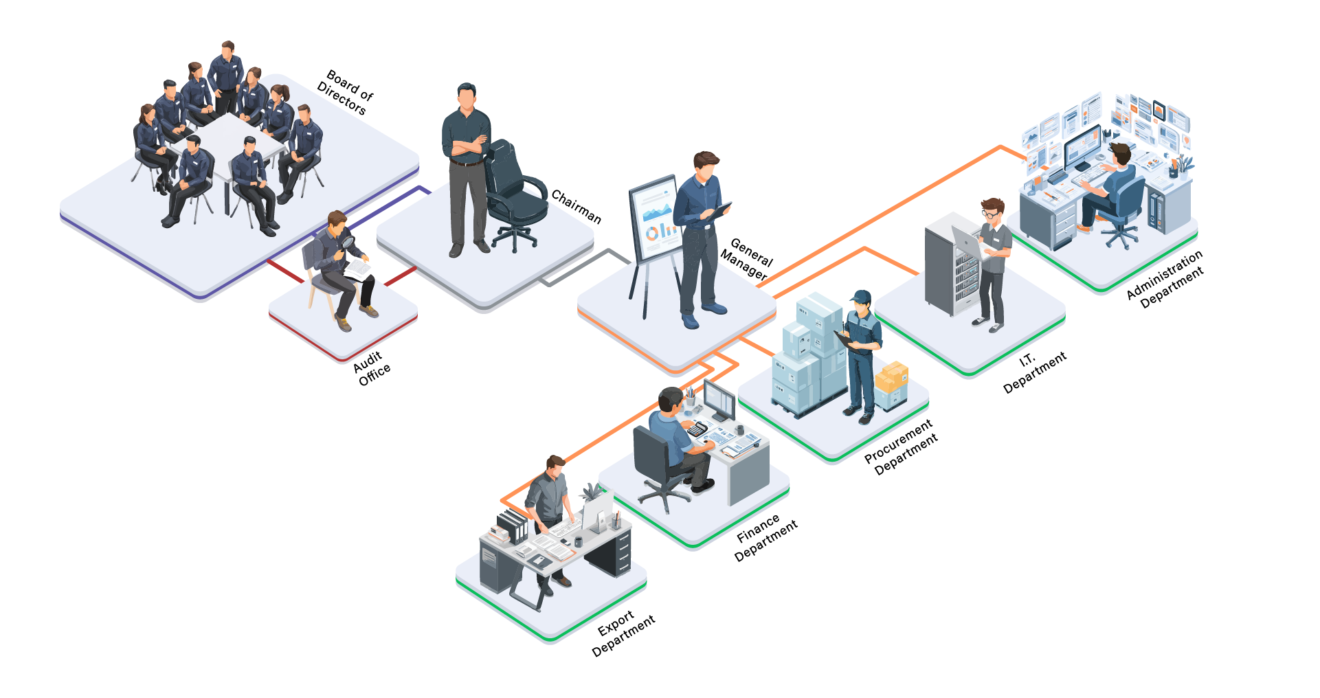 A visual breakdown of RayFu and its parent company, Chennan. The flowchart illustrates each department and its internal sectors, showing how they connect and collaborate within the organizational structure. Designed to clarify hierarchy, workflow, and cross department communication through visual mapping.